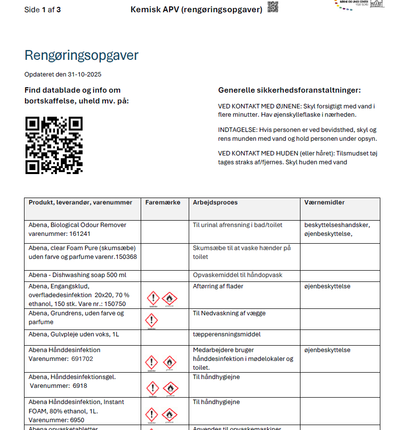 ForsideFor medarbejdereArbejdsmiljø og tillidsvalgteKemisk APVArbejdsmiljø og tillidsvalgteKemisk APVKemisk APVHer finder du vores seneste kemiske risikovurdering og sikkerhedsdatablade.senest opdateret 31. oktober 2025Kemisk risikovurderingRengøringsprodukter